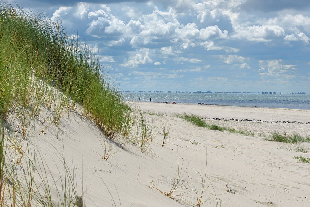 Vue sur la mer entre Ameland et Terschelling depuis la dune avec l'herbe à marmotte. Un ciel d'été menaçant au-dessus de la mer. Sur la plage, un poste de plage et des groupes de personnes au loin.