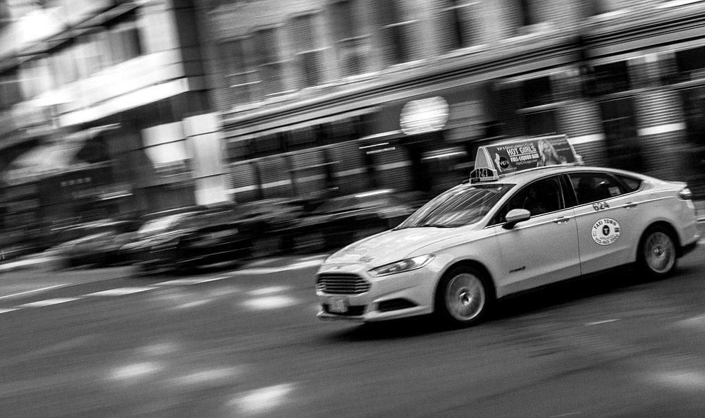 Amerika is het land van de auto's. Het verkeer is niet gebouwd voor wandelaars of fietsers, al zijn de binnensteden voetganger vriendelijker dan daarbuiten. De afstanden in steden zijn echter dusdanig groot, dat met over het algemeen toch de auto pakt. Ondanks dat de uber-taxi's enorm populair zijn, zijn er toch ook nog gewone taxidiensten. Tijdens een middagwandeling in Chicago reed deze taxi over het kruispunt. Door "panning" toe te passen, kreeg ik de taxi mooi in beeld en kon ik er voor zorgen dat de beweging van de auto mooi in beeld was. Later heb ik de foto omgezet naar zwart wit, wat een mooi effect geeft.
