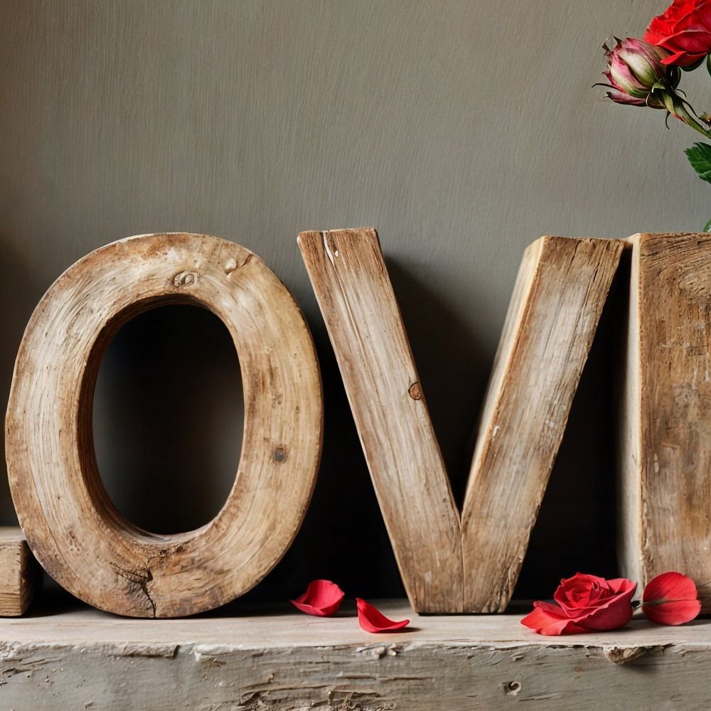 Sur une étagère en béton brut repose le mot **AMOUR**, formé par des lettres en bois usées par les intempéries.