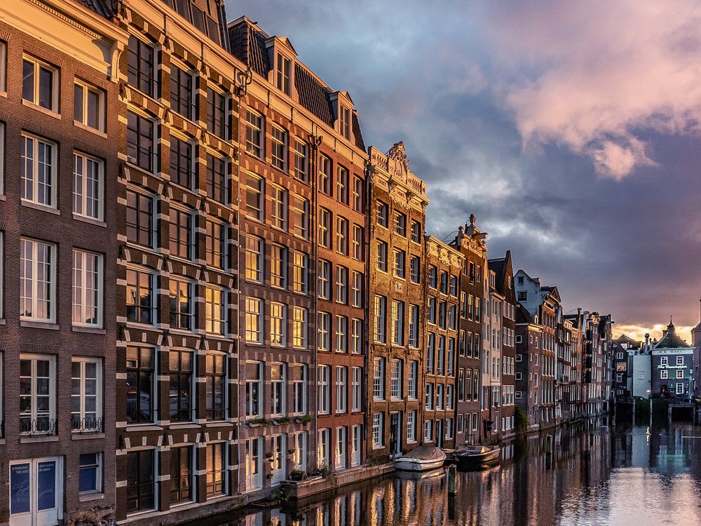 Photo au coucher du soleil sur le Damrak d'Amsterdam