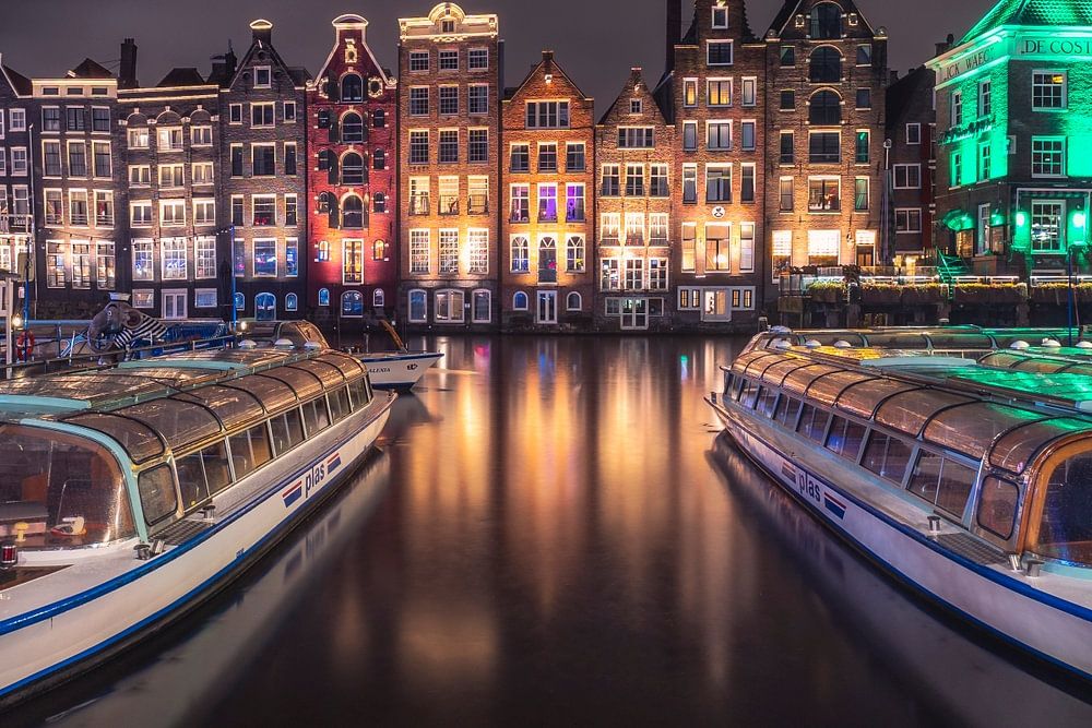 Le célèbre point des entrepôts sur le Damrak à Amsterdam. Avec les bateaux du canal, cela fait vraiment rayonner Amsterdam. On l'appelle aussi la Venise d'Amsterdam.