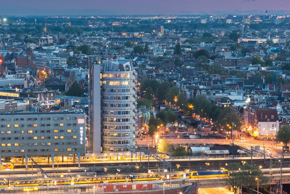 Amsterdam avec la gare centrale et, au loin, l'aéroport de Schiphol avec l'atterrissage d'un avion.