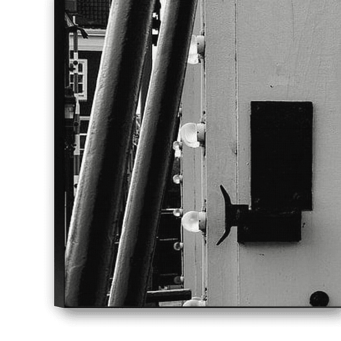La photo montre les deux sections du pont rétractable en bois, avec en arrière-plan les maisons typiques du canal d'Amsterdam le long de l'Amstel.
