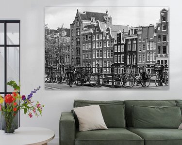 Amsterdamse Grachtenhuizen in Zwart / wit, de huizen vind je typisch aan de Amsterdamse grachten, Ook herkenbaar aan Nederland zijn de fietsen aan de brugleuning. Voor velen een herkenbaar taafereel.