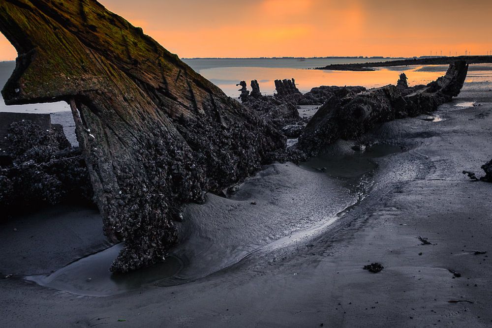 Vieux naufrage en bois aux Pays-Bas dans la province de Zélande. Ce vieux navire a été photographié avec un coucher de soleil et une vue de tempête.