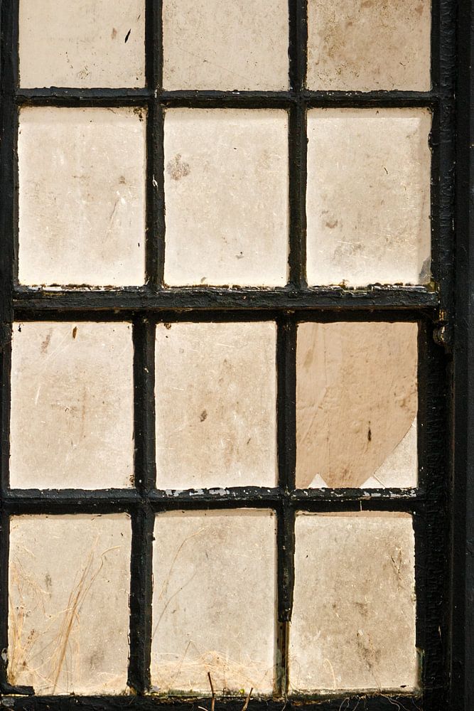 Vieille fenêtre aux vitres laiteuses dans un vieux mur brut avec de la peinture blanche à feuilles, des mousses et des plantes.