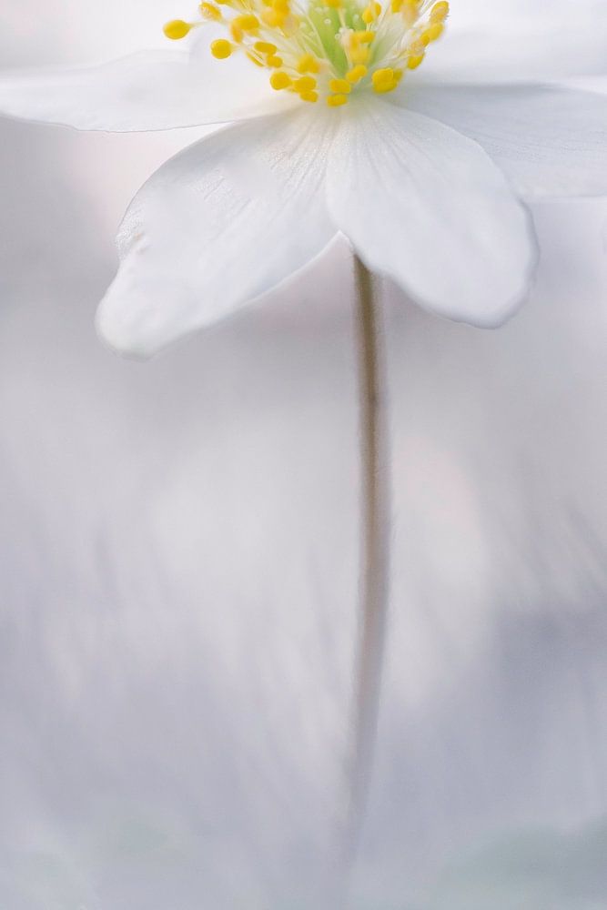 Gros plan d'une anémone des bois, photographiée avec un objectif macro. L'ambiance est sereine. C'est une image de rêve de cette petite fleur délicate qui ne mesure que quelques centimètres. La fleur se dresse fièrement avec ses étamines jaunes et attire tous les regards.