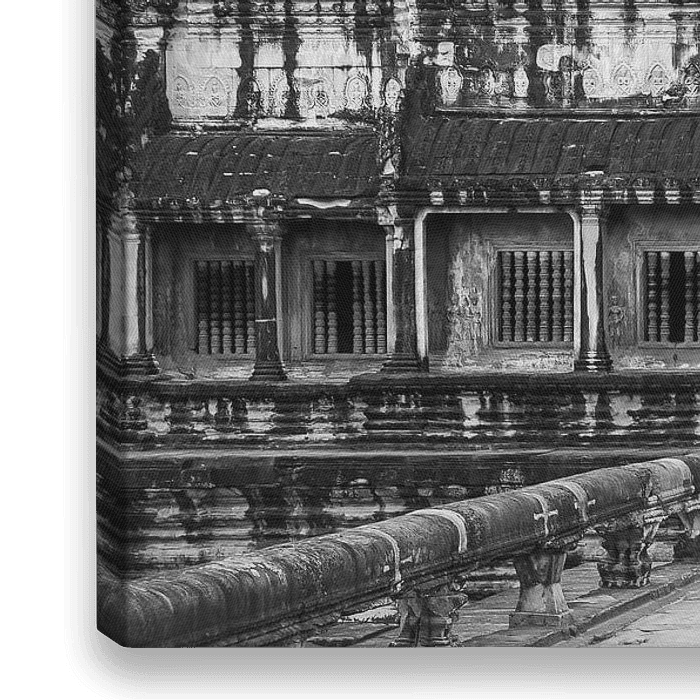 Photo 16:9 en noir et blanc d'Angkor Vat, un majestueux complexe de temples situé près de la ville de Siem Reap au Cambodge, et le plus grand monument religieux du monde. Le temple a été construit au 12e siècle sur ordre du roi Suryavarman II comme temple hindou dédié à Vishnu, mais il est devenu par la suite un important sanctuaire…