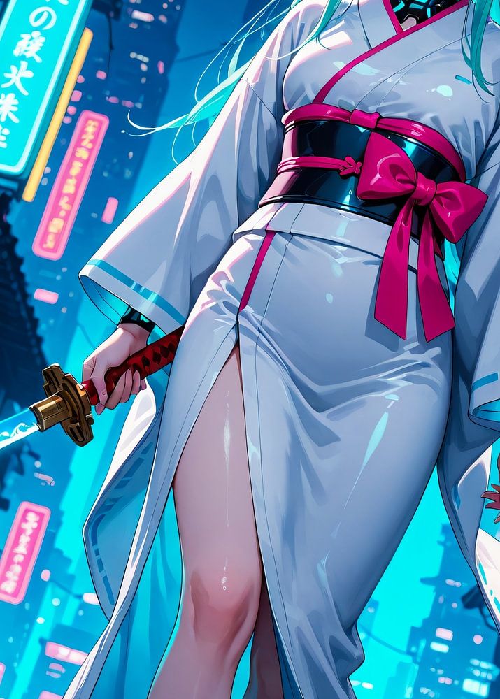 Baignée par la lueur des néons, elle traverse la ville comme une tempête forgée dans l'acier et le silence. Connue sous le nom de Neon Ronin, elle est l'épée de la justice, errant sans maître mais jurant de protéger les innocents des ombres qui rôdent dans les rues. Ses cheveux turquoise ondulent comme l'eau au clair de lune, ses yeux pourpres percent la tromperie et sa lame vibre d'une lueur spectrale qui lie l'esprit et l'acier. Bien qu'enracinée dans la tradition, sa présence jette un pont entre deux mondes : le passé sacré de l'honneur des samouraïs et le présent implacable du chaos éclairé par les néons.