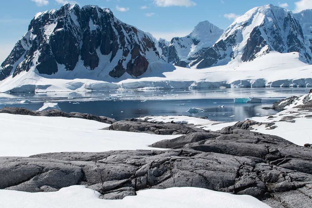 Magnifique paysage enneigé avec des montagnes, des rochers, un ciel bleu et une baie d'eau à Port Charcot sur l'île Booth en Antarctique, une destination de voyage lointaine et un endroit rêvé pour tous ceux qui aiment l'hiver, la neige et la nature. La photo a été prise en janvier lors d'une expédition de luxe en Antarctique (pôle Sud). Une période idéale (été) pour l'Antarctique et le mois le plus chaud de l'année avec un temps radieux. Il en résulte un sentiment indescriptible d'apaisement et de bien-être, une expérience unique avec une nature à couper le souffle.
