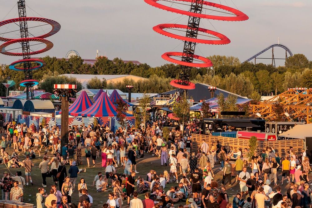 Un aperçu au festival Lowlands. Les spectateurs cherchent leur chemin sous un beau soleil du soir.