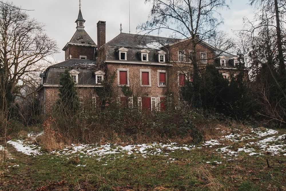 Deze foto toont een indrukwekkend verlaten mansion, verscholen midden in het donkere Belgische bos, omhuld door een dikke laag sneeuw. Van veraf genomen, krijgt het gebouw een bijna spookachtig uiterlijk. Het mansion steekt dreigend en eenzaam uit de witte, uitgestrekte vlakte, omringd door kale bomen die hun takken somber in de lucht steken. De sneeuw bedekt de grond als een onheilspellend wit tapijt, en de ijzige stilte van het bos lijkt de tijd stil te zetten. De schemerige winterse lucht voegt een extra laag mysterie en spanning toe aan het beeld, waardoor de verlatenheid van het mansion nog indringender wordt. Dit werk roept een gevoel van onheil en avontuur op, als een stille uitnodiging om verder te verkennen, maar tegelijkertijd een waarschuwing om voorzichtig te zijn.