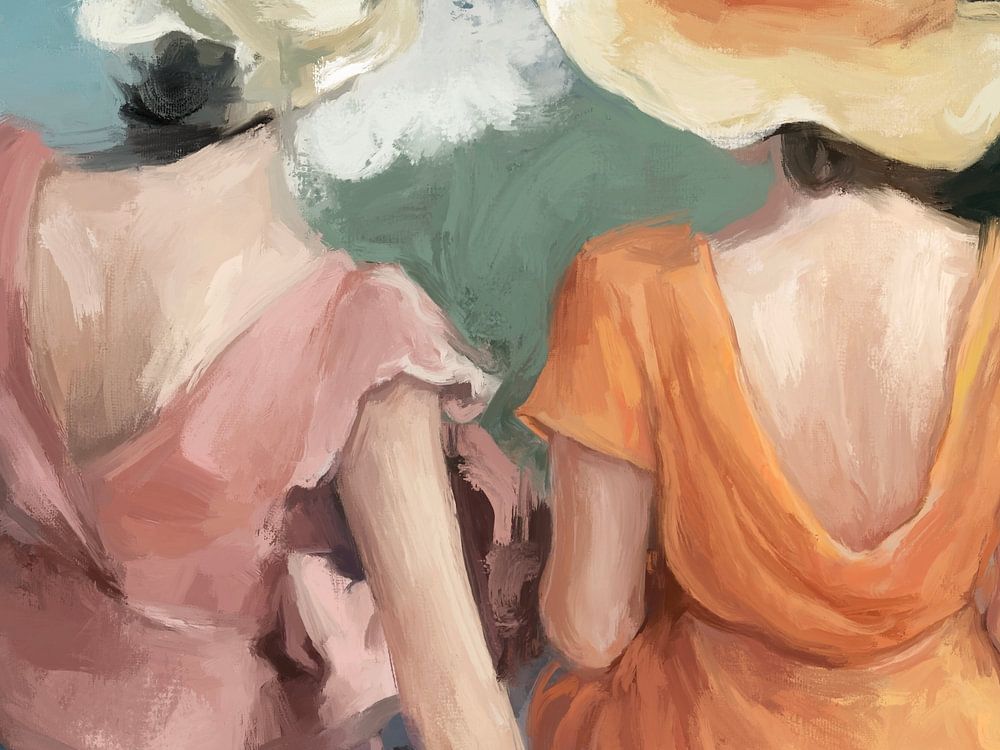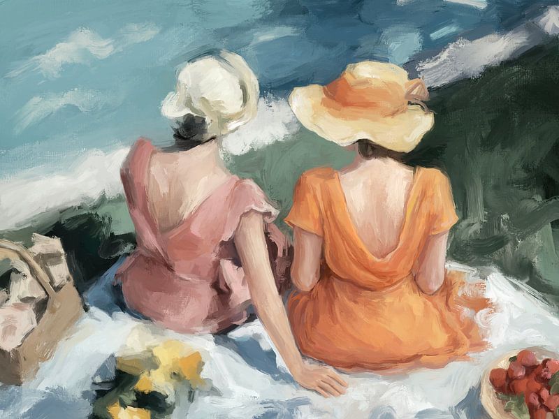 Une scène douce et impressionniste représentant deux femmes assises ensemble dans la nature, photographiées de dos dans des tons chauds et ensoleillés. Les coups de pinceau légers et les contrastes de couleurs doux évoquent le calme, l'intimité et la poésie tranquille des moments partagés.
