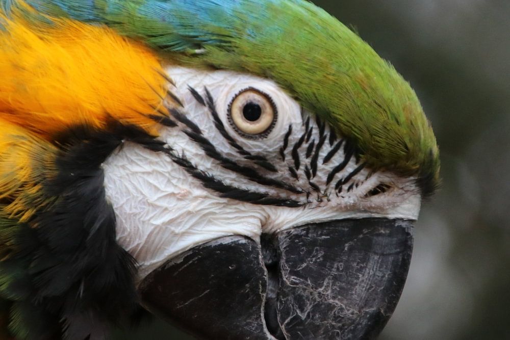 Sur la photo, nous voyons un ara bleu et jaune de près, la tête légèrement inclinée, comme s'il observait attentivement le spectateur. Ses plumes brillent de couleurs vives et les marques autour de son œil lui donnent un regard expressif, presque pénétrant.