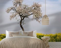 Arbre fruitier en fleurs parmi des plants de colza. L'arbre se détache magnifiquement sur le ciel printanier.