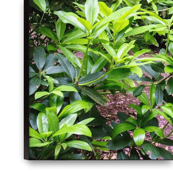 Le tronc séculaire d'un grand rhododendron au milieu d'un chemin caché sur le domaine De Wamberg, entouré du vert des rhododendrons plus jeunes.