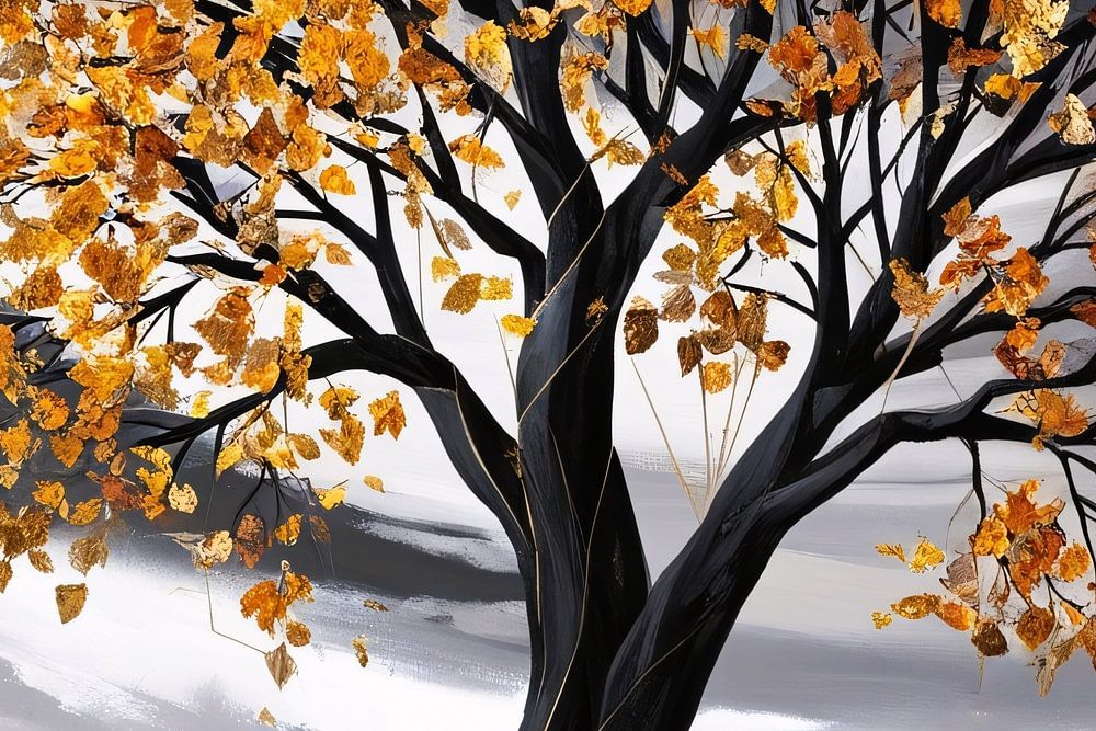 Cette œuvre d'art représente un arbre impressionnant dans un style abstrait, avec des feuilles d'automne vibrantes qui contrastent magnifiquement avec un paysage monochrome. Les tons or et orange des feuilles apportent de la chaleur et de l'énergie à l'image, tandis que les éléments en noir et blanc offrent un contraste puissant. L'ensemble crée une composition dynamique et harmonieuse qui s'intègre parfaitement dans un intérieur moderne. Cet objet d'art serait parfait dans une chambre à coucher ou un bureau, où il dégage à la fois tranquillité et force. Le design combine la nature et l'abstraction d'une manière unique, ce qui en fait un véritable accroche-regard dans n'importe quelle pièce.