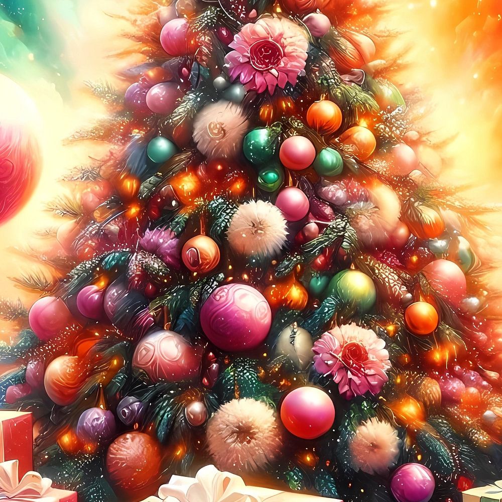 Un magnifique arbre de Noël avec des étoiles et des paquets cadeaux scintillants dans un style de peinture à l'huile. De gros ballons apparaissent autour de l'arbre de Noël dans des couleurs riches et saturées de rose, de blanc et de vert tendre, avec des pommes et des mandarines visibles. La peinture a une esthétique riche et luxuriante avec une lumière chaude et des couleurs irisées.
