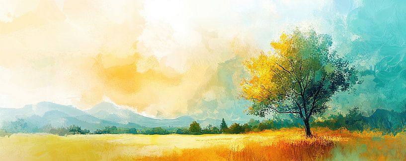 Printemps Arbre | Arbre Jaune - Cette peinture de paysage montre un bel arbre aux feuilles jaunes dans une prairie jaune d'or, tandis que le ciel présente un mélange chaleureux de tons bleus et orangés, évoquant une atmosphère paisible.