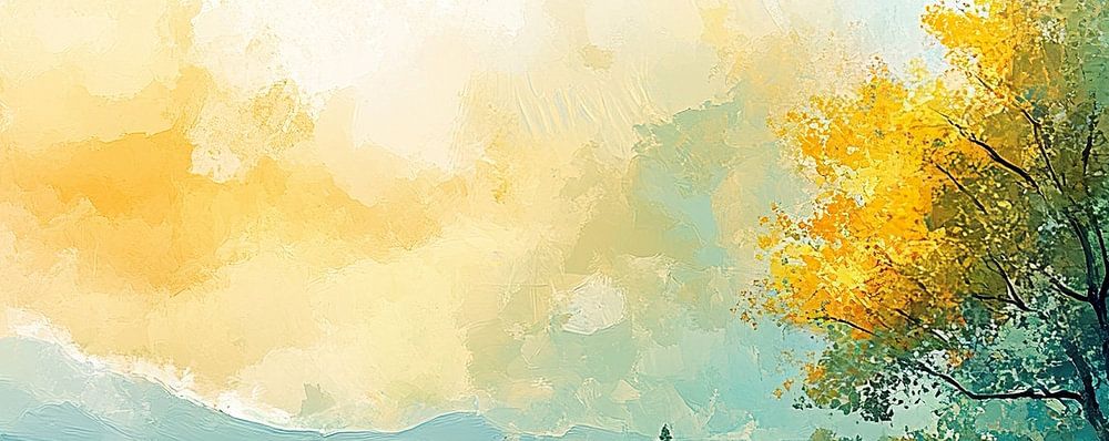 Détails : paysage, arbre, jaune, orange, bleu, nature, automne, atmosphère paisible, peinture, art moderne