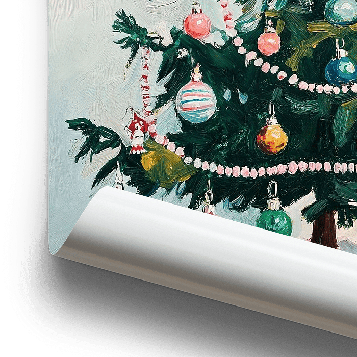 Arbre festif - Cette peinture d'arbre de Noël montre un arbre de Noël vert richement décoré avec des boules colorées et une étoile dorée au sommet, peint dans un style expressif et vibrant qui capture magnifiquement l'atmosphère festive.