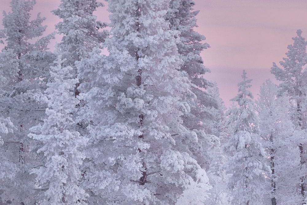 A propos de "Arbres enneigés en Laponie, ciel rose au coucher du soleil"