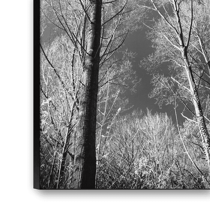 Photographie infrarouge en noir et blanc de grands arbres s'élançant vers le ciel. Les branches et les feuilles s'illuminent d'un blanc éclatant, tandis que le ciel est profondément sombre - une image pleine de contraste et de tranquillité. La technique infrarouge crée une atmosphère mystérieuse, presque onirique, qui transforme la forêt quotidienne en un paysage surréaliste. Cette image vous invite à lever les yeux et à découvrir la nature d'une manière différente.