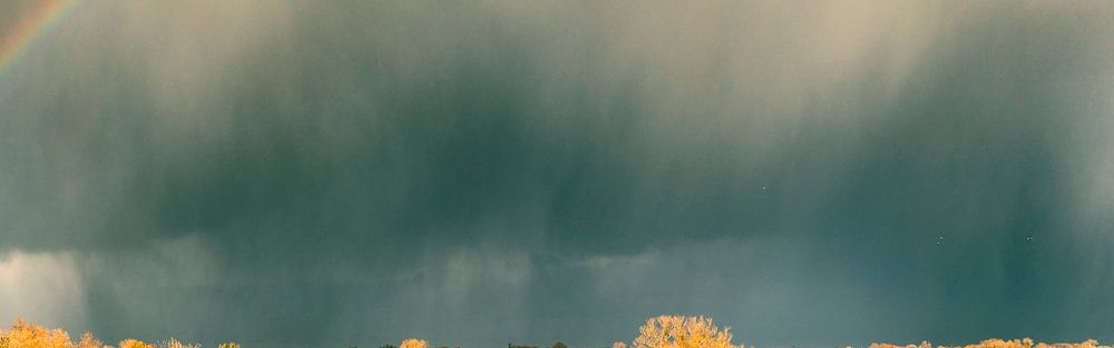 Arc-en-ciel lors d'une averse d'automne sur les plaines inondables de la rivière IJssel près de Zwolle en Overijssel, Pays-Bas. Les roseaux et les arbres au premier plan sont très éclairés tandis que le ciel à l'arrière-plan est sombre.
