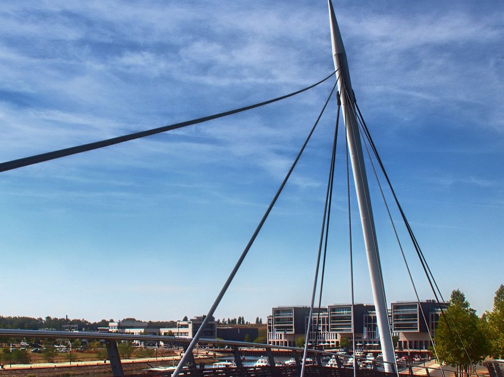 Pont pour piétons et cyclistes au-dessus de l'entrée du port Stölting Harbor sur le canal Rhin-Herne à Gelsenkirchen