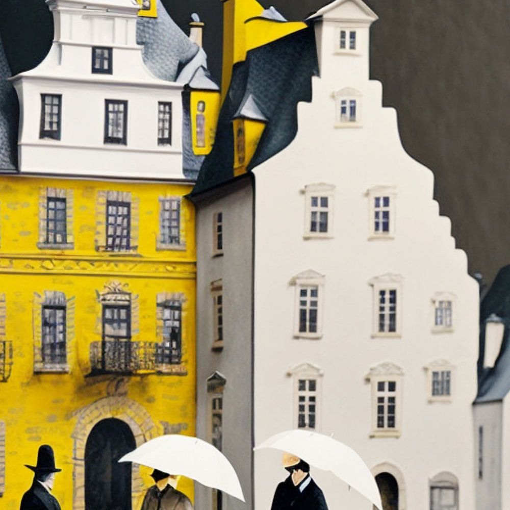 Dans un décor dramatiquement stylisé de maisons de ville jaunes et blanches de style baroque, trois personnages élégamment vêtus et portant des parapluies blancs se tiennent sur un fond sombre et rocheux. L'architecture semble tout droit sortie d'un diorama - riche en détails, mais en même temps artificiellement réduite. Le contraste entre les façades lumineuses et le ciel sombre ainsi que le sol non naturel crée une ambiance surréaliste, presque théâtrale. La scène semble figée - comme un moment d'un rêve ou d'un récit symbolique sur l'isolement, l'élégance et le pouvoir silencieux de l'observation.
