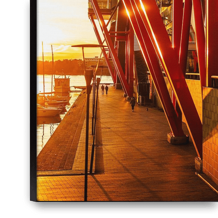 Bâtiment moderne aux poutres d’acier rouges le long du quai, baigné de lumière dorée. Tirage architectural élégant pour salon, loft ou bureau.