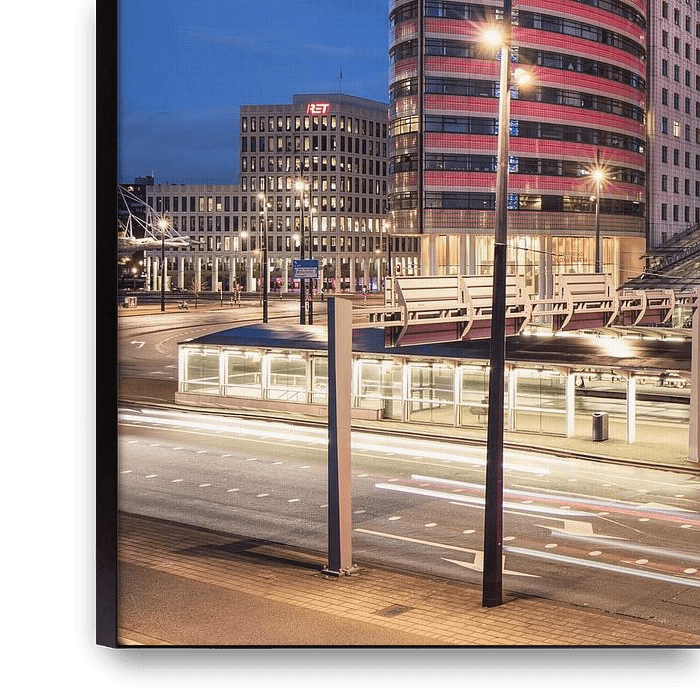 Une architecture saisissante sur la place Wilhelmina, Kop van Zuid, illuminée par la circulation en mouvement, le flou et les traînées de lumière