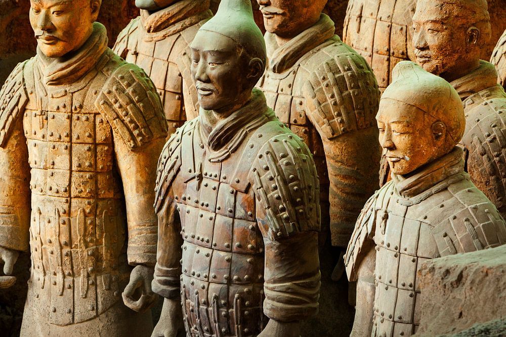 Gros plan de quelques statues de la célèbre armée de terre cuite de Xi'An. Sur la photo, il y a 3 rangées de soldats.