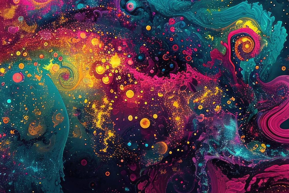 Laissez votre imagination danser sur les vagues de cet art DMT, une explosion de couleurs joyeuses enveloppant le mur d'une énergie psychédélique. Chaque teinte semble respirer, pulser et rayonner, créant un jeu de vibrations très vivant. La toile capture l'essence du voyage intérieur, avec des couleurs dansant en harmonie et brouillant les frontières de la réalité. L'orange brille comme le soleil levant, le vert vibre avec la force de vie et le bleu s'étend comme un ciel infini. Cette symphonie visuelle invite à la contemplation et à l'émerveillement joyeux, faisant de chaque regard un voyage dans les profondeurs du spectre des couleurs et de l'esprit.