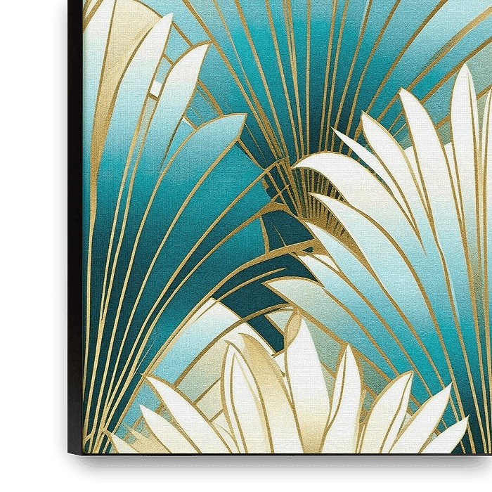 "Art Nouveau Feuilles de palmier en turquoise et blanc cassé" est une peinture numérique de style Art Nouveau. Le blanc cassé et le turquoise contrastent avec les détails dorés. Cela crée un look élégant.