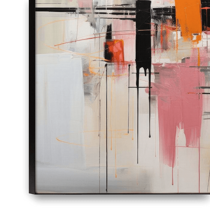 Peinture : Tableau abstrait en beige, noir, orange et rouge.