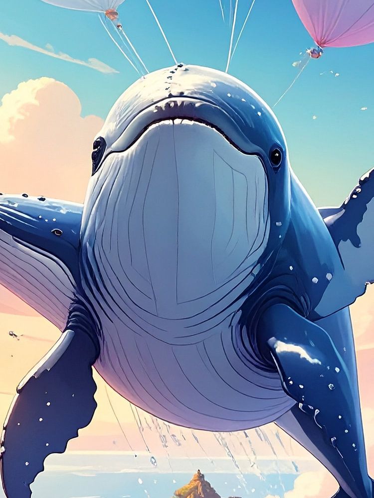 Illustration abstraite joyeuse et colorée d'une baleine sautant hors de l'eau, avec des éclaboussures dynamiques et picturales. Le dessin est lumineux, fantaisiste et moderne.