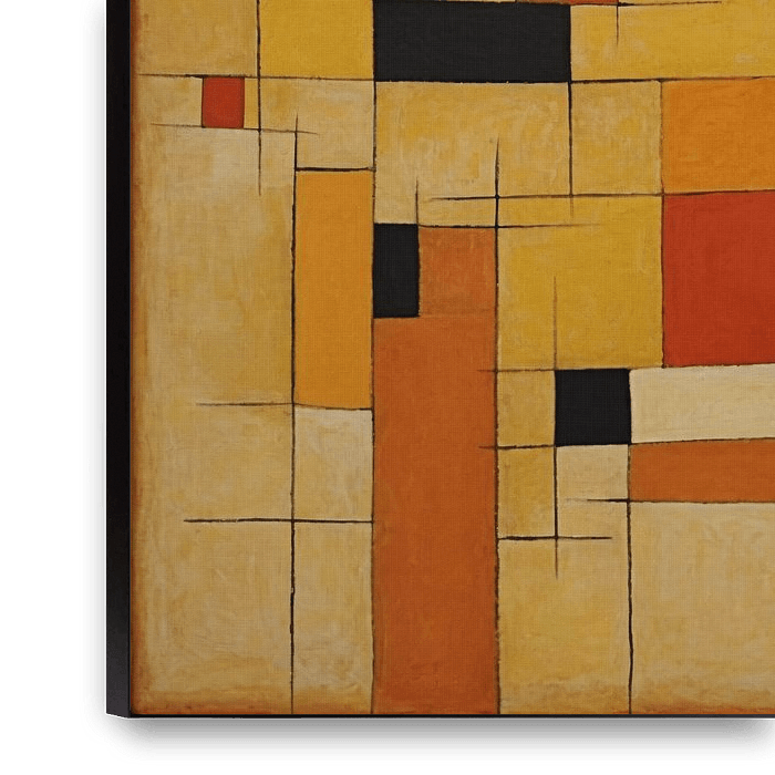 Découvrez l'équilibre harmonieux des formes géométriques et des couleurs vives avec cette œuvre d'art enchanteresse. Il s'agit d'une symphonie visuelle de teintes orange et jaunes, ponctuée de façon ludique par des accents noirs et blancs qui ajoutent une nouvelle dimension de profondeur à la composition. Cette création capture…