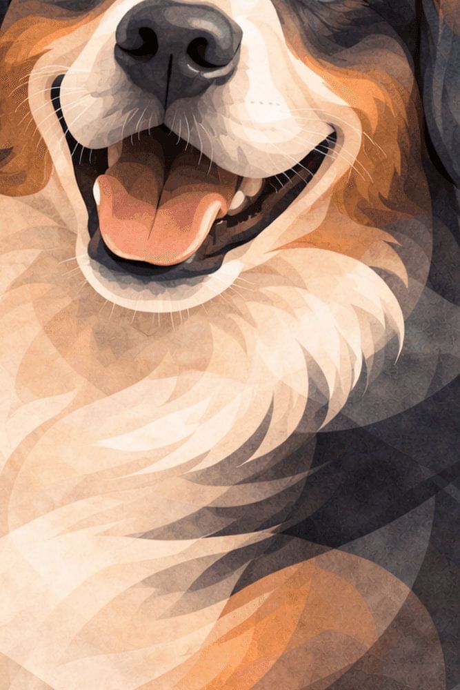 Un charmant portrait abstrait d'un bouvier bernois, combinant des couches texturées et des formes géométriques fluides dans des tons chauds de brun terreux, de crème et de bleu doux. Les yeux expressifs et le sourire joyeux capturent la personnalité loyale et affectueuse de cette race bien-aimée. Cette œuvre d'art moderne représentant…