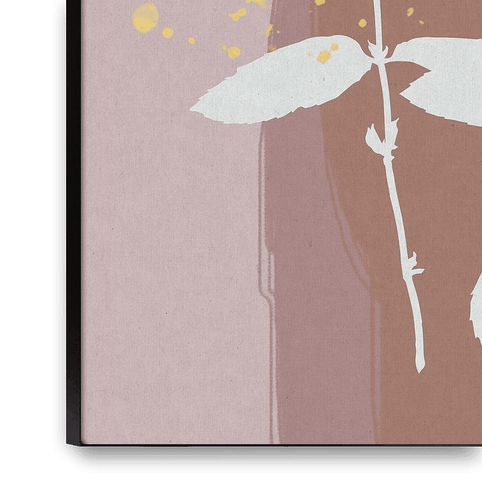 Art abstrait, botanique, art contemporain, formes organiques, traits de peinture en rose, vert, blanc et or.