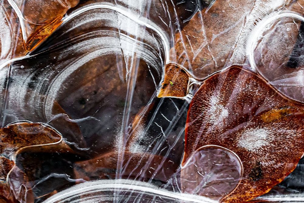 Quand il gèle, je cherche toujours des flaques d'eau gelées. Parfois, on trouve le véritable art de la glace. Cette photo est ma préférée de l'art de la glace, avec beaucoup de formes intéressantes et une belle combinaison des tons bruns chauds des feuilles avec le noir et blanc froid de la glace.