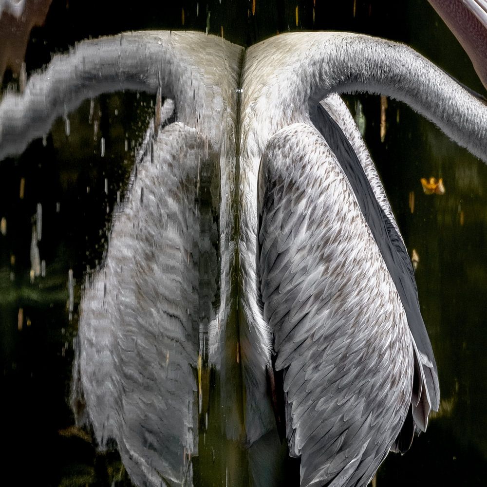 Ce pélican sauvage est venu jeter un coup d'œil à la nature néerlandaise. Le reflet de l'eau donne un effet magique qui le fait ressembler à une tête d'animal quand on le tourne d'un quart de tour. Il peut aussi s'agir d'un gnou ou d'un cerf.