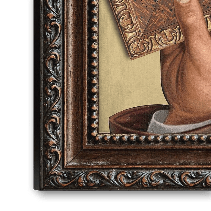 Une main sort d'un cadre classique richement décoré et tient un cadre plus petit et orné représentant un œil masculin.
