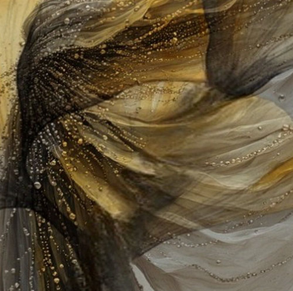 une jeune femme avec un chignon dans les cheveux et portant une robe de style art noveau or noir blanc marron sur des fleurs de calice de paon de la nature avec beaucoup de chaîne d'or argentée décorée tissu drapé sur un fond gris.
