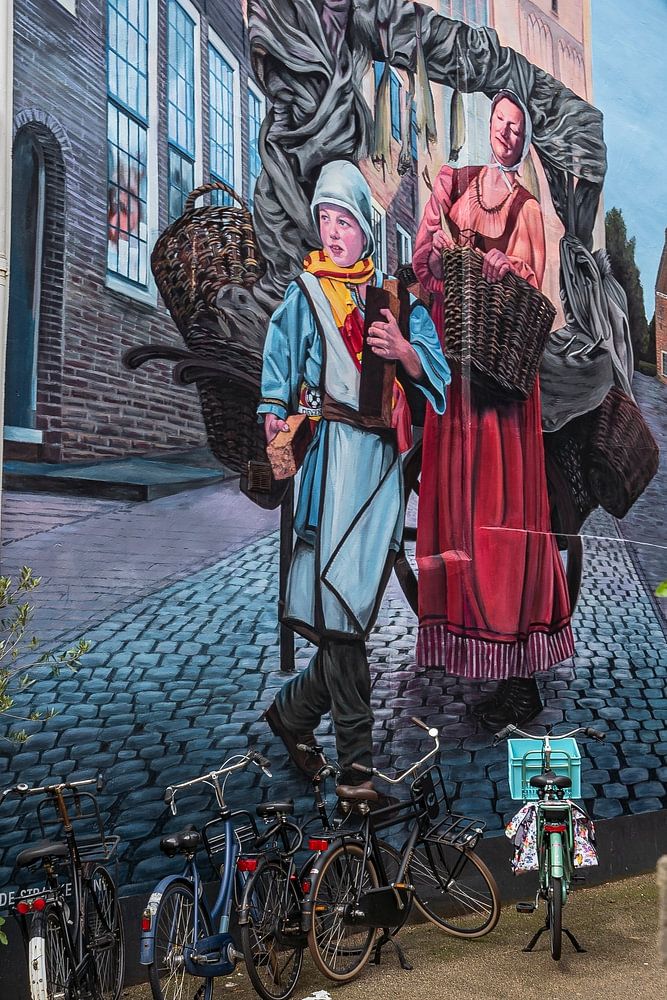 En me promenant dans Deventer, je suis tombé sur cette œuvre d'art, dont le mur entier a été soigneusement peint par un graffeur. La peinture murale représente une scène de marché avec une offrande de stockfish et de Deventer Koek.