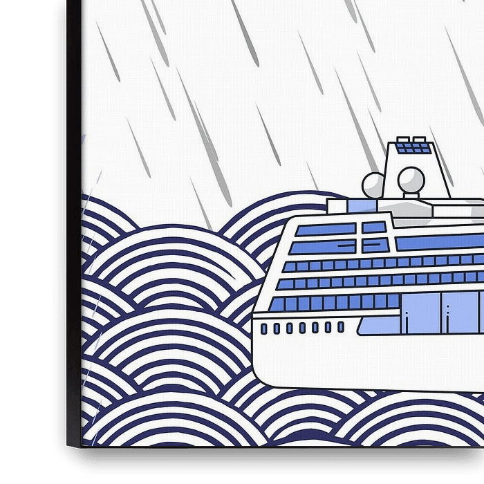 Un bateau de croisière solitaire se bat sur une mer déchaînée, sous des nuages circulaires hypnotiques et une pluie battante. Les vagues géométriques s'élèvent comme des motifs sans fin, symbolisant à la fois le chaos et le rythme, tandis que les lignes noires et bleues capturent la tension de la puissance de la nature. Cette œuvre…