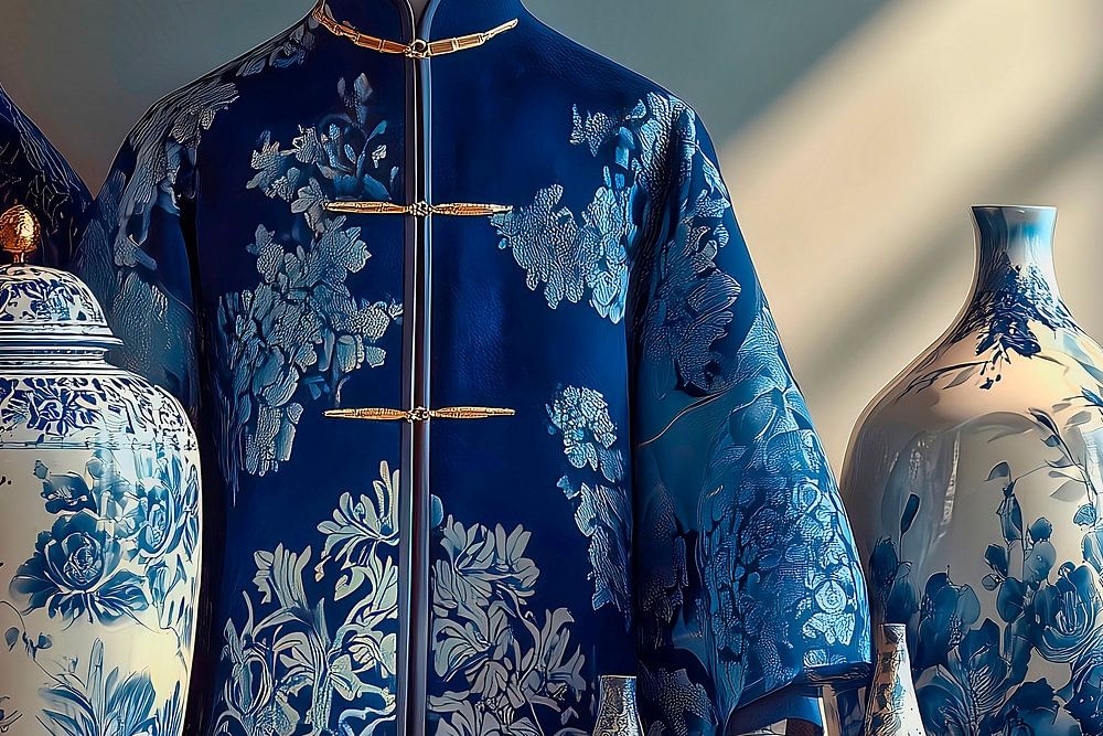 Nature morte composée de céramiques et de vêtements chinois traditionnels bleus et blancs. L'arrangement comprend des vases décoratifs de différentes formes et tailles, avec des motifs floraux complexes, et deux vêtements en soie bleue ornés de cols traditionnels chinois avec de délicats motifs floraux et des boutons dorés. La lumière…