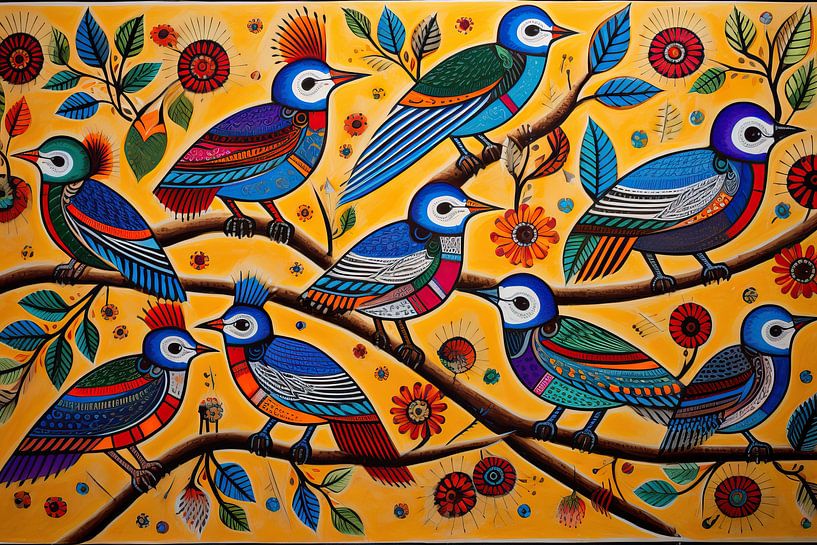 Atmosphère tropicale - Voici une belle représentation vibrante d'oiseaux tropicaux, dont le plumage détaillé et coloré attire l'attention sur un fond jaune chaud. Cette pièce d'aspect folklorique joue avec les motifs et les couleurs dans un style à la fois ludique et sophistiqué, clin d'œil à un tableau riche en nature et rempli de motifs floraux.