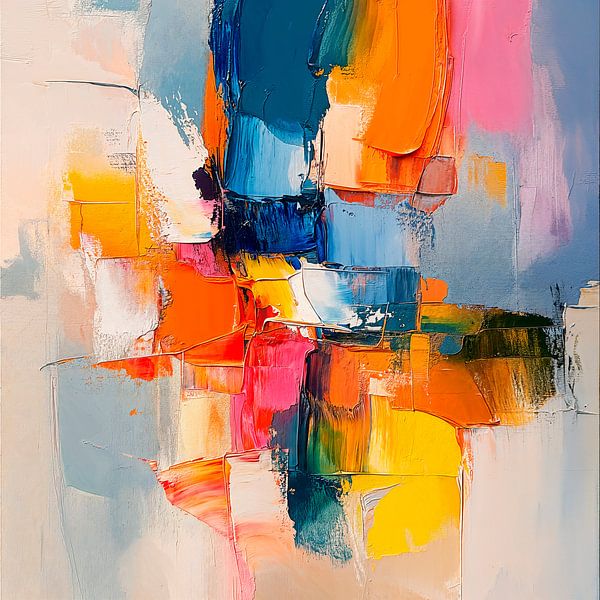 Une œuvre d'art abstraite aux coups de pinceau vifs, la composition est dynamique et asymétrique, avec des textures épaisses en impasto qui créent une impression de profondeur et de mouvement. Les formes sont principalement géométriques et cubiques, mais avec des bords adoucis et une qualité fluide, l'impression générale est énergique…