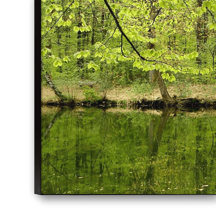 De l'autre côté, les arbres se reflètent dans l'eau. Parmi eux, il y a un hêtre rouge.